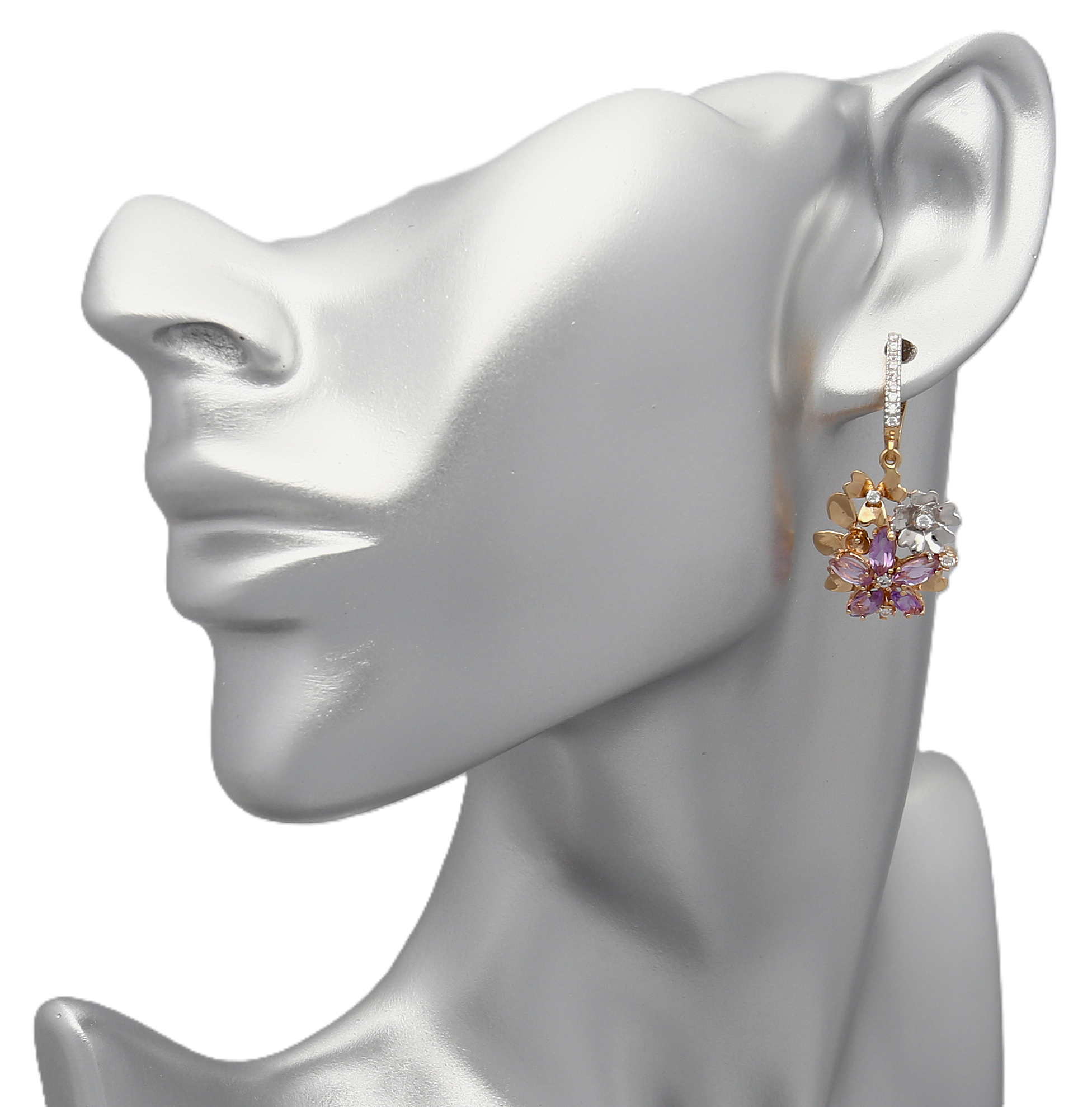 Dieses edle Schmuckset aus feinem 585er Rosé- und Weißgold (14 Karat) besteht aus einem Ring und passenden Ohrringen – beide in liebevoll gestaltetem Blumen-Design. Im Mittelpunkt jedes Stücks funkelt ein intensiv violetter Amethyst, der von fein gearbeiteten Brillanten elegant umrahmt wird.