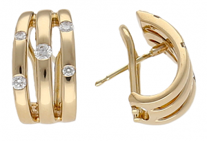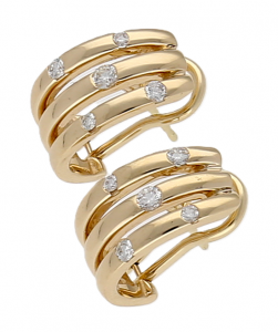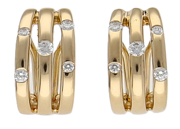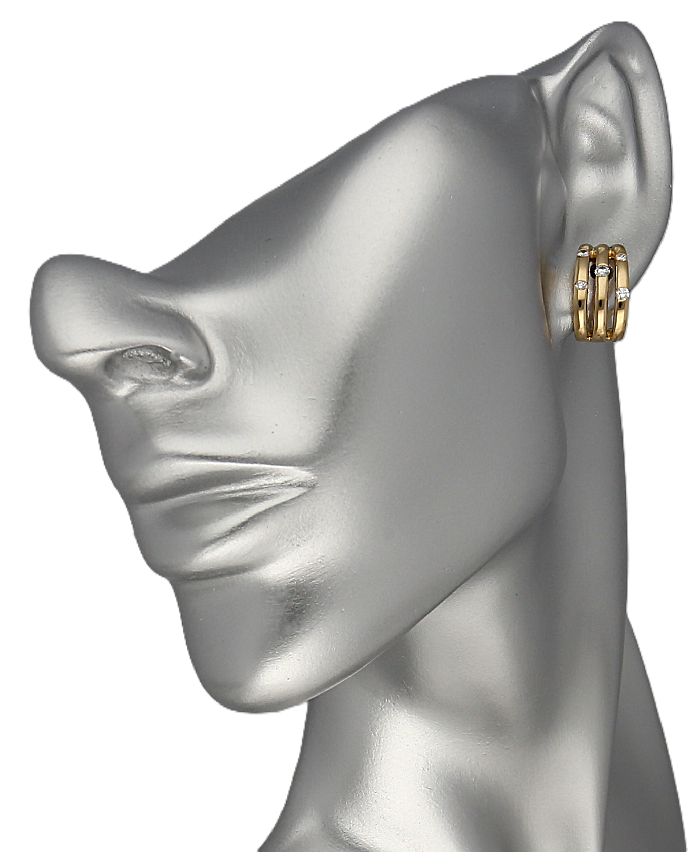 Die Vorderseite der Ohrringe ist in drei länglichen Reihen gestaltet, auf denen sorgfältig gefasste Brillanten mit insgesamt ca. 0,15 ct in VSI-Reinheit und weißem Farbton (Top Wesselton) für ein dezentes, aber edles Funkeln sorgen. Der praktische Klappverschluss sorgt für sicheren Halt und hohen Tragekomfort.