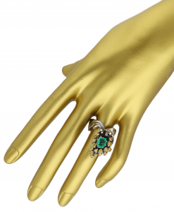 Im Zentrum steht ein intensiv grüner Smaragd von ca. 1,20 ct, kraftvoll gefasst und strahlend schön. Umrahmt wird der Edelstein von gelben Brillanten in seltener Kanarienfarbe, mit einem Gesamtgewicht von ca. 1,00 ct – ein farbliches Zusammenspiel, das Eleganz und Extravaganz meisterhaft vereint.