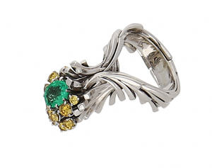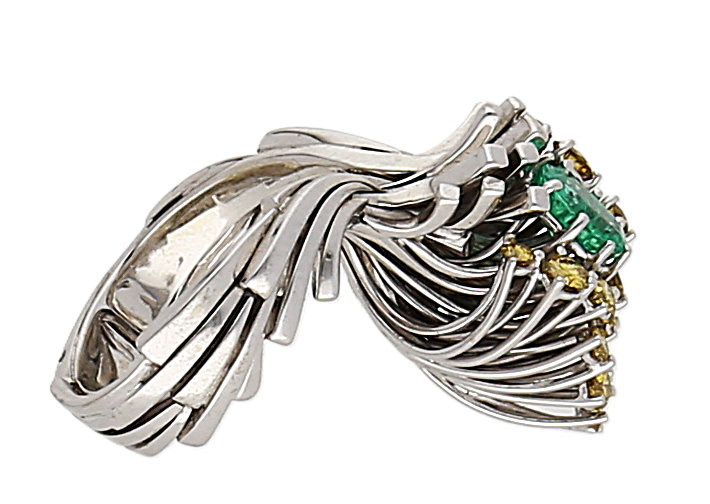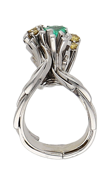 Einzigartiger Designer-Ring aus 750er Weißgold mit Smaragd & gelben Brillanten